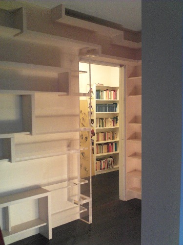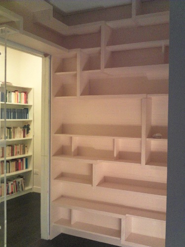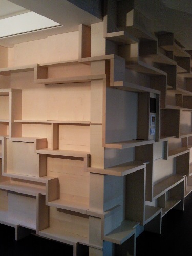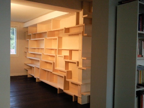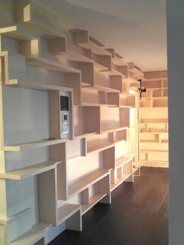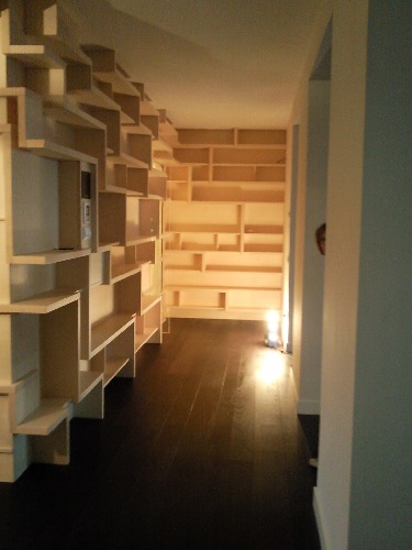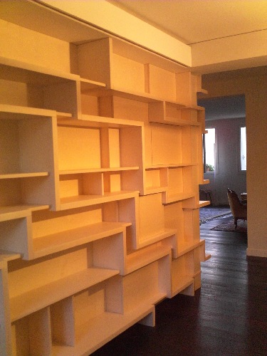 Struttura in listellare pioppo, massellata ed impiallacciata legno acero europeo, con finitura naturale ad acqua. Ogni pezzo è praticamente diverso dagli altri, grazie alla schiena strutturale incastrata a “puzzle”, che evita giunture a vista. Questa libreria inconsueta presenta ripiani che si rincorrono sui tre lati, degradando verso il pavimento in un movimento plastico creato dalle diverse profondità, trasformandosi di fatto in una scultura “funzionale”.