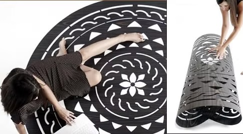 - Augusteo: Dalla rivisitazione di un particolare di pavimento a mosaico di età augustea in Cividale del Friuli, Udine, prende forma un tappeto flessibile realizzato in films lignei precomposti od essenze pure accoppiati con rete tecnica e forati. Il procedimento artigianale garantisce estrema cura dei dettagli ed eccellenza manifatturiera. Finitura ad olio di agrumi. Diametro massimo di 2m. Spessore 2 mm. Arrotolabile. Misure, essenze e finiture personalizzabili.